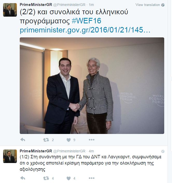 “Ο Πρωθυπουργός, Αλέξης Τσίπρας, πραγματοποίησε στο Νταβός κατ’ ιδίαν συνάντηση με τη Γενική Διευθύντρια του Διεθνούς Νομισματικού Ταμείου, κα. Κριστίν Λαγκάρντ, και είχαν μια ειλικρινή συζήτηση για την πορεία του ελληνικού προγράμματος. Ο Πρωθυπουργός υπογράμμισε στη Γενική Διευθύντρια του ΔΝΤ ότι ο χρόνος αποτελεί κρίσιμη παράμετρο για την επιτυχημένη ολοκλήρωση της πρώτης αξιολόγησης και συνολικά του ελληνικού προγράμματος. Συμφωνήθηκε ότι οι καθυστερήσεις δεν αποτελούν στόχο καμιάς από τις δύο πλευρές. Επίσης, συμφωνήθηκε να υπάρχει απευθείας επικοινωνία ανάμεσα στην ελληνική κυβέρνηση και το ΔΝΤ προκειμένου η κάθε πλευρά να έχει σαφή αντίληψη για τις θέσεις της άλλης” αναφέρει σε ανακοίνωσή του το γραφείο του Πρωθυπουργού.