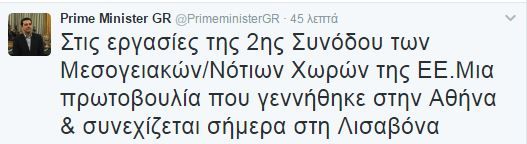 Με ανάρτησή του στο twitter που συνοδεύεται από φωτογραφίες από τις εργασίες της Συνόδου της Λισαβόνας που βρίσκονται σε εξέλιξη, ο Πρωθυπουργός Αλέξης Τσίπρας, επισημαίνει ότι η πρωτοβουλία της Συνόδου των μεσογειακών/νότιων χωρών της ΕΕ γεννήθηκε στην Αθήνα και συνεχίζεται σήμερα στην πορτογαλική πρωτεύουσα.