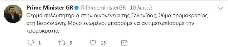 «Μόνο ενωμένοι μπορούμε να αντιμετωπίσουμε την τρομοκρατία», τονίζει ο Αλέξης Τσίπρας σε ανάρτησή του στο Twitter, εκφράζοντας τα θερμά συλλυπητήριά του στην οικογένεια της Ελληνίδας, θύμα τρομοκρατίας στη Βαρκελώνη.Ειδικότερα, ο πρωθυπουργός αναφέρει στην ανάρτησή του: «Θερμά συλλυπητήρια στην οικογένεια της Ελληνίδας, θύμα τρομοκρατίας στη Βαρκελώνη. Μόνο ενωμένοι μπορούμε να αντιμετωπίσουμε την τρομοκρατία».