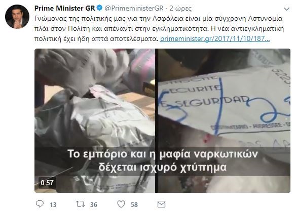 Η ανάρτηση του Πρωθυπουργού συνοδεύεται από βίντεο με τίτλο «Μία νέα αντιεγκληματική πολιτική εφαρμόζεται» στο οποίο περιγράφεται το έργο της αστυνομίας.