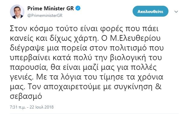 Με ανάρτηση στον προσωπικό του λογαριασμό στο twitter ο Πρωθυπουργός Αλέξης Τσίπρας αποχαιρετά τον Έλληνα ποιητή, στιχουργό και πεζογράφο Μάνο Ελευθερίου που απεβίωσε την Κυριακή από ανακοπή καρδιάς…