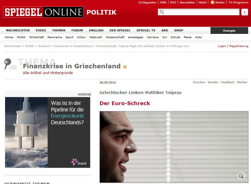 “Τσίπρας, ο τρόμος του ευρώ” είναι ο τίτλος δημοσιεύματος του γερμανικού περιοδικού Spiegel, που αναφέρεται στην “επικίνδυνη” όπως τη χαρακτηρίζει, άνοδο του ΣΥΡΙΖΑ, καθώς και στις θέσεις του αρχηγού του κόμματος, Αλέξη Τσίπρα.”Το δικαίωμα να παραμείνουν στο ευρώ, χωρίς να εκπληρώσουν τις δεσμεύσεις του προγράμματος λιτότητας, αξιώνει ο Αλέξης Τσίπρας, που συνεχίζει την πορεία σύγκρουσης με την Ευρωπαϊκή Ένωση και το ΔΝΤ.” γράφει το Spiegel και συνεχίζει: “Ο Αλέξης Τσίπρας κατά τις ομιλίες του διατυπώνει απλές προτάσεις, όπως αυτή:’Εάν χρωτάς στην τράπεζα 5.000 ευρώ, είναι δικό σου πρόβλημα. Αν όμως χρωστάς στην τράπεζα 500.000 ευρώ, τότε είναι πρόβλημα της τράπεζας’. -που διατύπωσε τη βρετανική εφημερίδα Guardian” σημειώνει το περιοδικό. “Για τον Τσίπρα προέχει το εξής θέμα: Η αποδυνάμωση της ελληνικής κοινωνίας, μέσα από τα επιβεβλημένα μέτρα λιτότητας. Το πρόγραμμα του κόμματός του, αποτελείται από δέκα σημεία-προτάσεις, μόνο για την αρχή -τα οποία μπορούν να συμπυκνωθούν στα εξής: την αντίσταση ενάντια στις μεταρρυθμίσεις στην αγορά εργασίας, την ακύρωση των περικοπών στους μισθούς και τις συντάξεις. Ενώ από την άλλη υπόσχεται την επανάκτηση των εργασιακών κεκτημένων και απορρίπτει τους όρους του πακέτου διάσωσης της Ευρωπαϊκής Ένωσης.” αναφέρει το γερμανικό περιοδικό.