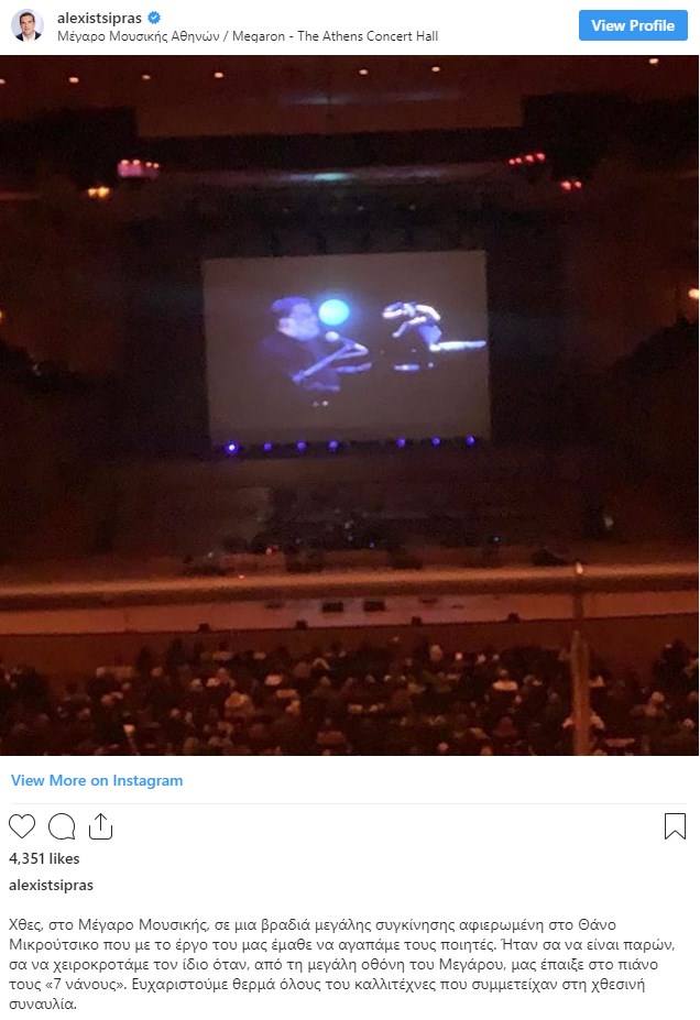“Ναι, ήταν το δώρο που μας ζητούσαν επίμονα εδώ και καιρό τα παιδιά μας. Αποφασίσαμε να τους κάνουμε έκπληξη και να τους πάρουμε ένα σκυλάκι. Την ονόμασαν Κάρμεν. Είναι πολύ γλυκιά. Και επιτέλους έχουμε και ένα κορίτσι στο σπίτι” είχε πει. Στο Μέγαρο Μουσικής βρέθηκαν το βράδυ της Δευτέρας 20 Ιανουαρίου, ο Αλέξης Τσίπρας και η Μπέτυ Μπαζιάνα, προκειμένου να παρακολουθήσουν τη μεγάλη συναυλία που διοργανώθηκε στη μνήμη του Θάνου Μικρούτσικου. Σε ανάρτησή του στο Instagram, o πρόεδρος του ΣΥΡΙΖΑ έκανε λόγο για “βραδιά μεγάλης συγκίνησης” και ευχαρίστησε θερμά τους καλλιτέχνες που συμμετείχαν στη συναυλία. “Χθες, στο Μέγαρο Μουσικής, σε μια βραδιά μεγάλης συγκίνησης αφιερωμένη στο Θάνο Μικρούτσικο που με το έργο του μας έμαθε να αγαπάμε τους ποιητές. Ήταν σα να είναι παρών, σα να χειροκροτάμε τον ίδιο όταν, από τη μεγάλη οθόνη του Μεγάρου, μας έπαιξε στο πιάνο τους ‘7 νάνους’. Ευχαριστούμε θερμά όλους του καλλιτέχνες που συμμετείχαν στη χθεσινή συναυλία”, έγραψε ο Αλέξης Τσίπρας.