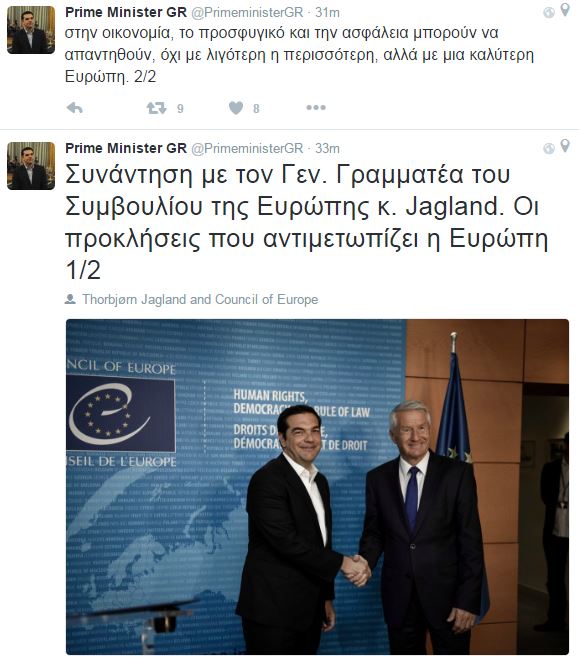 Ο Πρωθυπουργός, Αλέξης Τσίπρας από το Στρασβούργο όπου βρίσκεται, ανέβασε μία φωτογραφία στο twitter από τη συνάντησή του με τον γ.γ του Συμβουλίου της Ευρώπης, κ. Τζάγκλαντ.
