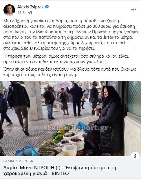 “Μια 80χρονη γυναίκα στη Λαμία, που προσπαθεί να ζήσει με αξιοπρέπεια, καλείται να πληρώσει πρόστιμο 300 ευρώ για άσκοπη μετακίνηση. Την ίδια ώρα που ο περιοδεύων Πρωθυπουργός γράφει στα παλιά του τα παπούτσια τη δημόσια υγεία, τα έκτακτα μέτρα, αλλά και κάθε πολίτη αυτής της χώρας ξεχωριστά, που στερεί στοιχειώδεις ελευθερίες του για να τα τηρήσει”, σημειώνει ο πρόεδρος του ΣΥΡΙΖΑ – Προοδευτική Συμμαχία, Αλέξης Τσίπρας σε ανάρτησή του στα κοινωνικά δίκτυα, παραπέμποντας σε σχετικό ρεπορτάζ του τοπικού τύπου.