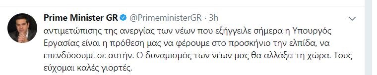 Ο πρωθυπουργός αναφέρει στον προσωπικό του λογαριασμό στο twitter πως «η απόδοση του κοινωνικού μερίσματος δεν είναι πράξη ευαισθησίας αλλά κοινωνικής δικαιοσύνης. Οι νέοι μας είναι πιο ευάλωτοι στις πιέσεις της οικονομικής κρίσης αλλά είναι κι η ελπίδα μας για το μέλλον».