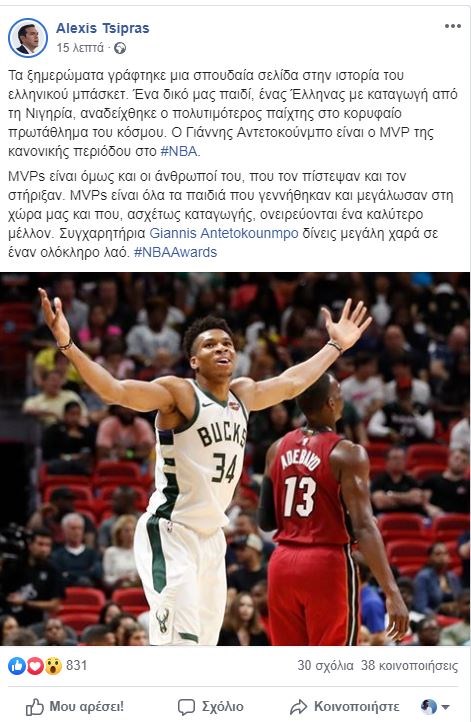 «Συγχαρητήρια Γιάννη Αντετοκούνμπο δίνεις μεγάλη χαρά σε έναν ολόκληρο λαό», έγραψε στη σελίδα του στο Facebook, ο πρωθυπουργός Αλέξης Τσίπρας, δίνοντας τα συγχαρητήριά του στον Έλληνα μπασκετμπολίστα, που αναδείχθηκε ως ο πολυτιμότερος παίκτης της χρονιάς στο NBA.Ο κ. Τσίπρας γράφει στην ανάρτησή του: «Τα ξημερώματα γράφτηκε μια σπουδαία σελίδα στην ιστορία του ελληνικού μπάσκετ. Ένα δικό μας παιδί, ένας Έλληνας με καταγωγή από τη Νιγηρία, αναδείχθηκε ο πολυτιμότερος παίχτης στο κορυφαίο πρωτάθλημα του κόσμου. Ο Γιάννης Αντετοκούνμπο είναι ο MVP της κανονικής περιόδου στο #NBA.MVPs είναι όμως και οι άνθρωποί του, που τον πίστεψαν και τον στήριξαν. MVPs είναι όλα τα παιδιά που γεννήθηκαν και μεγάλωσαν στη χώρα μας και που, ασχέτως καταγωγής, ονειρεύονται ένα καλύτερο μέλλον. Συγχαρητήρια Giannis Antetokounmpo δίνεις μεγάλη χαρά σε έναν ολόκληρο λαό. #NBAAwards».