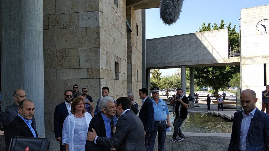 Ο Πρωθυπουργός έφτασε στις 10:30 το πρωί στο δημαρχείο και στο προαύλιο τον υποδέχθηκαν ο δήμαρχος Γιάννης Μπουτάρης, η πρόεδρος του δημοτικού συμβουλίου, Καλυψώ Γούλα, καθώς και οι δύο φρουροί του δημάρχου που ήταν μαζί του κατά την επίθεση που δέχθηκε το περασμένο Σάββατο, στην πλατεία του Λευκού Πύργου, κατά τη διάρκεια των εκδηλώσεων για τη Γενοκτονία των Ποντίων.