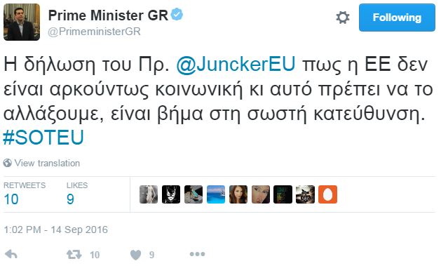 «Η δήλωση του προέδρου Γιουνκέρ πως η ΕΕ δεν είναι αρκούντως κοινωνική κι αυτό πρέπει να το αλλάξουμε, είναι βήμα στη σωστή κατεύθυνση» αναφέρει ο πρωθυπουργός Αλέξης Τσίπρας σε ανάρτησή του στο Twitter σχετικά με τις δηλώσεις του προέδρου της Ευρωπαϊκής Επιτροπής για την κατάσταση της ΕΕ, ενώπιον του Ευρωπαϊκού Κοινοβουλίου.