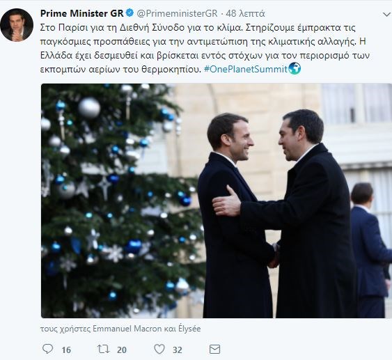 «Στο Παρίσι για τη Διεθνή Σύνοδο για το κλίμα. Στηρίζουμε έμπρακτα τις παγκόσμιες προσπάθειες για την αντιμετώπιση της κλιματικής αλλαγής. Η Ελλάδα έχει δεσμευτεί και βρίσκεται εντός στόχων για τον περιορισμό των εκπομπών αερίων του θερμοκηπίου. #OnePlanetSummit».