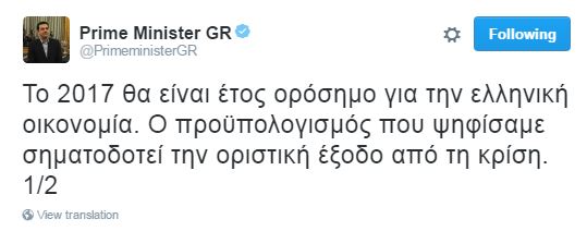 «Το 2017 θα είναι έτος ορόσημο για την ελληνική οικονομία. Ο προϋπολογισμός που ψηφίσαμε σηματοδοτεί την οριστική έξοδο από την κρίση. Μ’ ένα νέο αξιακό και παραγωγικό πρότυπο, διαμορφώνοντας τις προϋποθέσεις για μια ισχυρή και βιώσιμη οικονομία», σημειώνει σε ανάρτηση του στο Twitter ο πρωθυπουργός Αλέξης Τσίπρας.