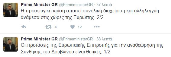 «Οι προτάσεις της Ευρωπαϊκής Επιτροπής για την αναθεώρηση της Συνθήκης του Δουβλίνου είναι θετικές» έγραψε στο twitter ο Πρωθυπουργός, Αλέξης Τσίπρας προσθέτοντας ότι «η προσφυγική κρίση απαιτεί συνολική διαχείριση και αλληλεγγύη ανάμεσα στις χώρες της Ευρώπης».