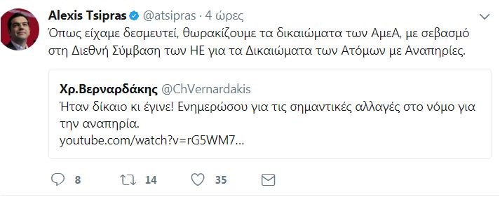 «Όπως είχαμε δεσμευτεί, θωρακίζουμε τα δικαιώματα των ΑμεΑ, με σεβασμό στη Διεθνή Σύμβαση των Ηνωμένων Eθνών για τα Δικαιώματα των Ατόμων με Αναπηρίες», αναφέρει σε σχόλιό του στον προσωπικό του λογαριασμό στο Twitter ο πρωθυπουργός Αλέξης Τσίπρας.Η ανάρτηση του πρωθυπουργού πλαισιώνεται και από το Tweet του υπουργού Επικρατείας Χριστόφορου Βερναρδάκη, με τον τίτλο «ήταν δίκαιο και έγινε», στο οποίο αναφέρονται, μέσω βίντεο που έδωσε στη δημοσιότητα ο υπουργός Επικρατείας, οι αλλαγές στο νόμο για τα άτομα με αναπηρία.«Η νομοθετική ρύθμιση προβλέπει την αναγνώριση της νοηματικής γλώσσας και της ελληνικής γραφής Braille, την προστασία όλων των δικαιωμάτων των αναπήρων από το κράτος, τη διασφάλιση της ισότιμης πρόσβασης των αναπήρων στο φυσικό και δομημένο περιβάλλον, την ισότιμη πρόσβαση στα προγράμματα σπουδών των ΑΕΙ και των ΤΕΙ, την υποχρέωση των δημοσίων και των ιδιωτικών ΜΜΕ να σέβονται την αρχή της μη διάκρισης, την ίδρυση ειδικού γραφείου για την προστασία των αναπήρων σε κάθε υπουργείο, Περιφέρεια, δήμο. Ακόμη τη διασφάλιση της βασικής πληροφόρησης για τους αναπήρους κατά τις συναλλαγές τους με τους φορείς του Δημοσίου και του ιδιωτικού τομέα, με προσβάσιμους για τα άτομα αυτά τρόπους», αναφέρεται στο βίντεο.