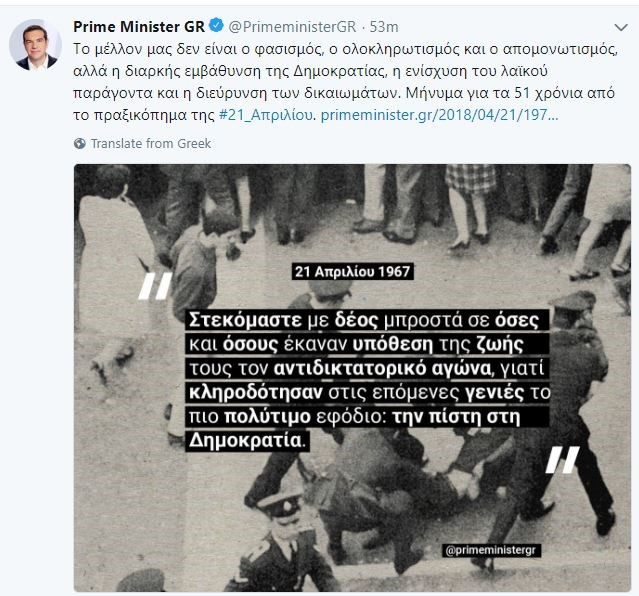 «Το μέλλον μας δεν είναι ο φασισμός, ο ολοκληρωτισμός και ο απομονωτισμός, αλλά η διαρκής εμβάθυνση της Δημοκρατίας, η ενίσχυση του λαϊκού παράγοντα και η διεύρυνση των δικαιωμάτων. Μήνυμα για τα 51 χρόνια από το πραξικόπημα της #21_Απριλίου».