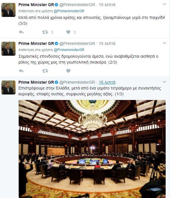 “Επιστρέφουμε στην Ελλάδα, μετά από ένα γεμάτο τετραήμερο με συναντήσεις κορυφής, επαφές ουσίας, συμφωνίες μεγάλης αξίας” επισημαίνει σε ανάρτησή του στο twitter o Πρωθυπουργός Αλέξης Τσίπρας.