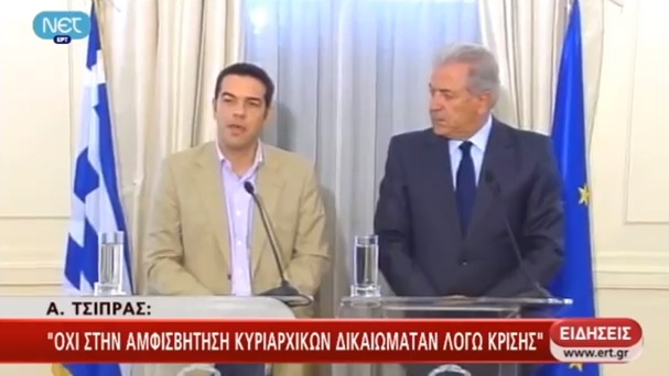 Την ανησυχία του για την κατάσταση στην Συρία εξέφρασε ο Αλέξης Τσίπρας στον Δημήτρη Αβραμόπουλο στην συνάντηση που είχαν σήμερα.”Είχαμε την ευκαιρία με τον Υπουργών των Εξωτερικών να ανταλλάξουμε σκέψεις πάνω σε κρίσιμα ζητήματα”, τόνισε ο πρόεδρος του ΣΥΡΙΖΑ και πρόσθεσε: “Του εκθέσαμε την ανησυχία μας για τις εξελίξεις στη Συρία και την ανθρωπιστική διάσταση που παίρνει η κρίση στην γειτονική αυτή χώρα, για το κύμα προσφύγων που αναπόφευκτα θα δημιουργηθεί και του ζητήσαμε να παρέμβει η χώρα μας, προκειμένου να υπάρξει βοήθεια από την ΕΕ για να διερευνηθεί η δυνατότητα φιλοξενίας από τη δική μας την πλευρά προσφύγων που θα πρέπει να τους δοθεί η δυνατότητα να επαναπατριστούν, όταν θα αντιμετωπιστεί η κρίση στην περιοχή”. Δείτε το βίντεο από τον ΣΚΑΊ