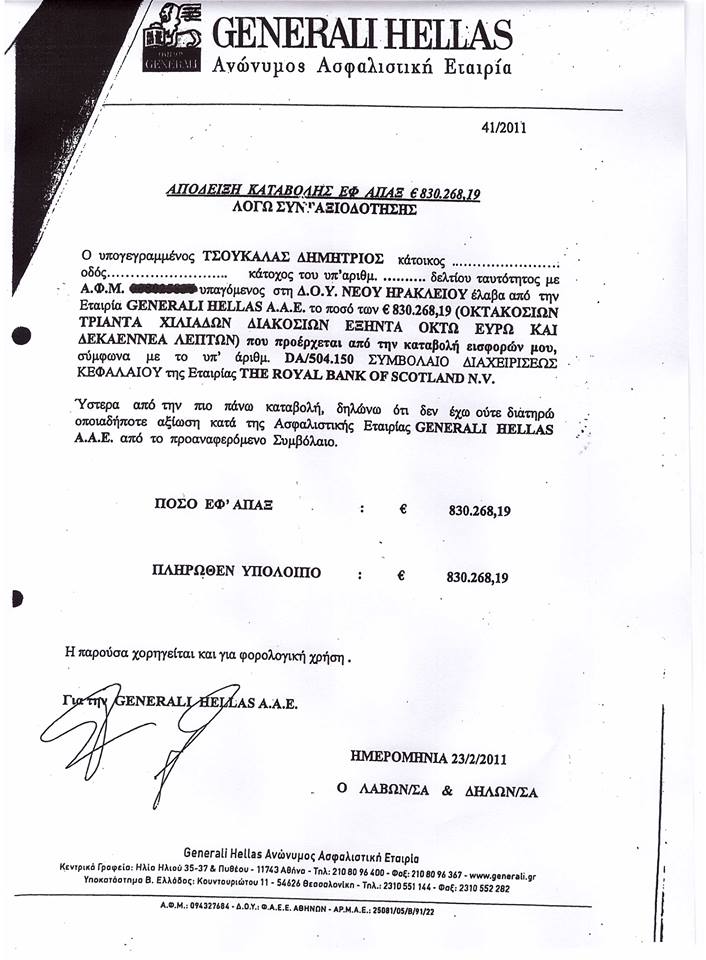 3. Την υπ’ αριθ. 41/2011 Απόδειξη καταβολής αποζημίωσης από την «GENERALI HELLAS Ανώνυμος Ασφαλιστική Εταιρεία», από την οποία προκύπτει ότι έλαβα το αναγραφόμενο ποσό, που προέρχεται από την καταβολή εισφορών, σύμφωνα με το υπ’ αριθμ. DA/504.150 ΣΥΜΒΟΛΑΙΟ ΔΙΑΧΕΙΡΙΣΕΩΣ ΚΕΦΑΛΑΙΟΥ της εταιρείας «THE ROYAL BANK OF SCOTLAND N.V.»