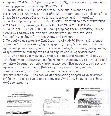 “Γίνεται λοιπόν απέλπιδα προσπάθεια να συνδεθεί η αποζημίωσή μου από την ιδιωτική ασφαλιστική εταιρεία με Δημόσιο Χρήμα. Δηλώνω ρητώς ότι εργαζόμουν μέχρι τον Γενάρη του 2010 στην ολλανδική τράπεζα ABN-AMRO, η οποία τότε εξαγοράστηκε από την Royal Bank of Scotland, από όπου και εγώ συνταξιοδοτήθηκα το Δεκέμβρη του 2010, όπως προκύπτει και από τα συνημμένα στη δήλωση «πόθεν έσχες» έγγραφα, τα οποία ηθελημένα αποκρύπτετε: