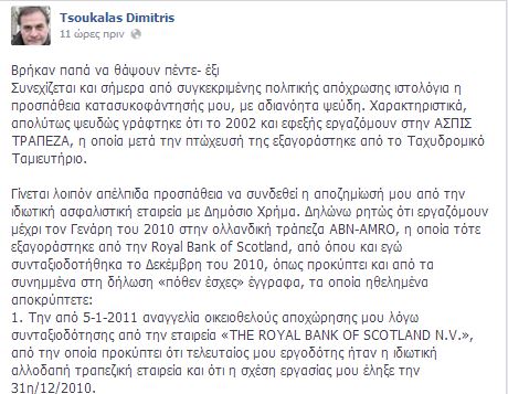«Βρήκαν παπά να θάψουν πέντε-έξι. Συνεχίζεται και σήμερα από συγκεκριμένης πολιτικής απόχρωσης ιστολόγια η προσπάθεια κατασυκοφάντησής μου, με αδιανόητα ψεύδη. Χαρακτηριστικά, απολύτως ψευδώς γράφτηκε ότι το 2002 και εφεξής εργαζόμουν στην ΑΣΠΙΣ ΤΡΑΠΕΖΑ, η οποία μετά την πτώχευσή της εξαγοράστηκε από το Ταχυδρομικό Ταμιευτήριο» αναφέρει ο βουλευτής του ΣΥΡΙΖΑ, Δημήτρης Τσουκαλάς, σε ανάρτηση στο προσωπικό του προφίλ στο facebook.
