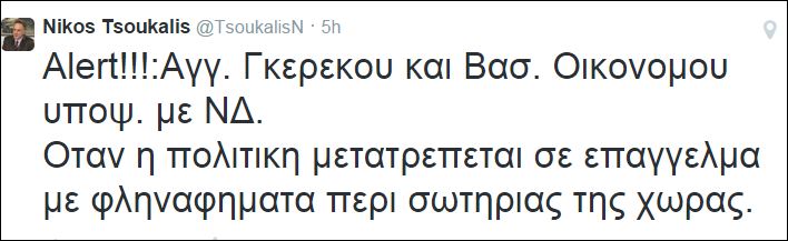 «Alert!!!: Αγγ. Γκερέκου και Βασ. Οικονόμου υποψ. με ΝΔ. Όταν η πολιτική μετατρέπεται σε επάγγελμα με φληναφήματα περί σωτηρίας της χώρας», έγραψε ο Νίκος Τσούκαλης στο twitter.