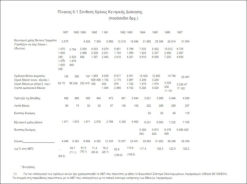 «Πιο κάτω παραθέτω τον πίνακα 6.1 με τίτλο “Σύνθεση Χρέους Κεντρικής Διοίκησης (ποσά σε δισεκ. δρχ)” των ετών από 1987 έως και 1997. Είναι απολογιστικά (οριστικά στοιχεία). Ο πίνακας αυτός της εξέλιξης του χρέους περιλαμβάνεται στην Εισηγητική έκθεση του Προϋπολογισμού έτους 1998 (Κυβέρνηση του κ. Σημίτη), (σελίδα 180) η οποία ψηφίστηκε από την Βουλή και έγινε νόμος του Κράτους