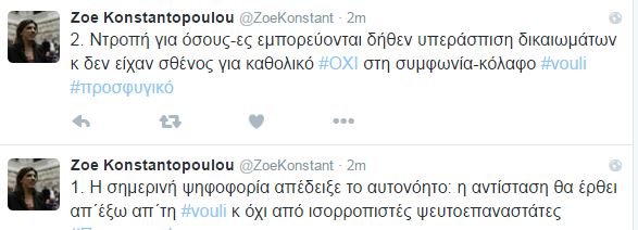 Ντροπή για όσους-ες εμπορεύονται δήθεν υπεράσπιση δικαιωμάτων κ δεν είχαν σθένος για καθολικό #ΟΧΙ στη συμφωνία-κόλαφο» έγραψε η Ζωή Κωνσταντοπούλου στον προσωπικό της λογαριασμό στο twitter.