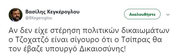«Αν δεν είχε στέρηση πολιτικών δικαιωμάτων ο Τζοχατζό είναι σίγουρο ότι ο Τσίπρας θα τον έβαζε υπουργό Δικαιοσύνης», έγραψε στον προσωπικό λογαριασμό του ο κ. Κεγκέρογλου.