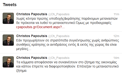 Ο βουλευτής του ΠΑΣΟΚ, Χρήστος Παπουτσής επισημαίνει μέσω του twitter “ότι χωρίς κέντρα υποδοχής παράνομων μεταναστών δεν πρόκειται να λυθεί το μεταναστευτικό” ενώ σχολιάζει ότι τα πολιτικά κόμματα εφόσοσν αποφάσισαν να συναινέσουν στο ζήτημα της οικονομίας, κάπου έπρεπε να διαφοροποιηθούν…και επέλεξαν το μεταναστευτικό”… Διαβάστε τα twits:
