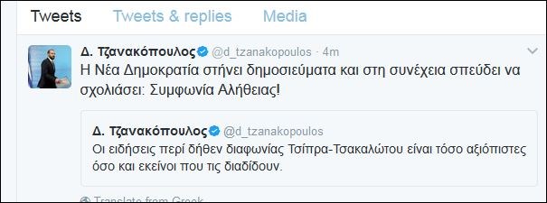“Οι ειδήσεις περί δήθεν διαφωνίας Τσίπρα-Τσακαλώτου είναι τόσο αξιόπιστες όσο και εκείνοι που τις διαδίδουν”, σημειώνει ο υπουργός Επικρατείας και κυβερνητικός εκπρόσωπος Δημήτρης Τζανακόπουλος, με ανάρτησή του στο Twitter και προσθέτει: “Η Νέα Δημοκρατία στήνει δημοσιεύματα και στη συνέχεια σπεύδει να σχολιάσει: Συμφωνία Αλήθειας!”.