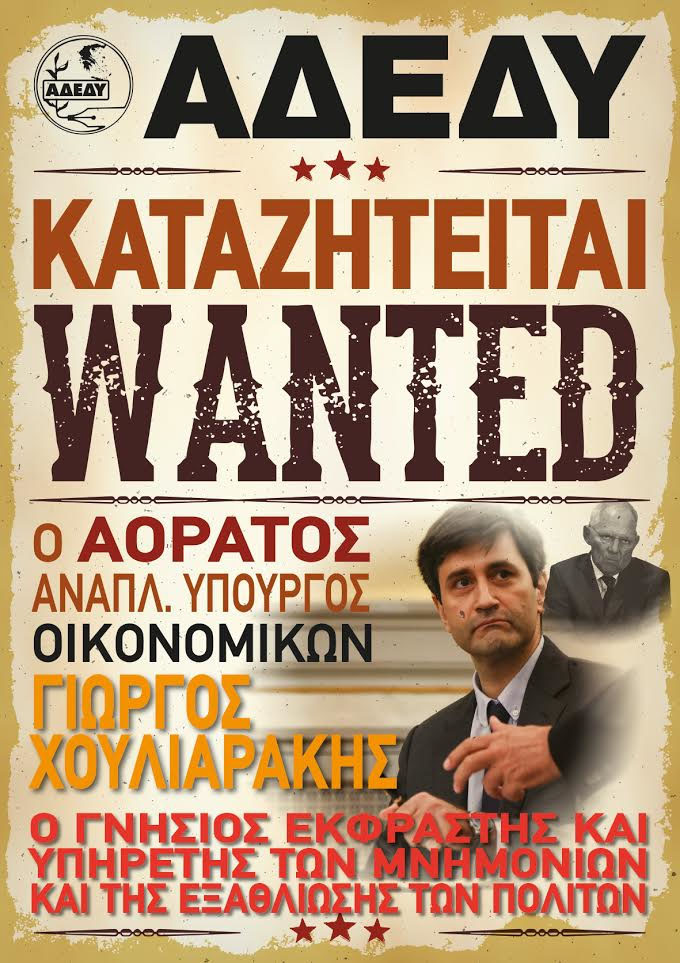 Την αφίσα της ΑΔΕΔΥ, με την οποία ο Γιώργος Χουλιαράκης εμφανίζεται ως «καταζητούμενος» στην Άγρια Δύση καταδίκασε το βράδυ της Παρασκευής η κυβέρνηση κάνοντας λόγο για κανιβαλισμό, ανθρωποφαγία και πολιτική χυδαιότητα.