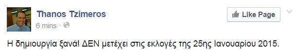 Με ένα μακροσκελές κείμενο στο λογαριασμό του στο facebook, ο Θάνος Τζήμερος έκανε γνωστό ότι το κόμμα του “Δημιουργία Ξανά” δε θα μετέχει στις εκλογές της 25ης Ιανουαρίου.