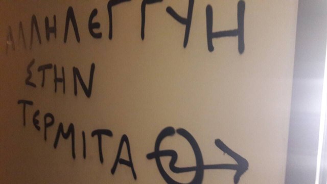 Όπως θα δείτε στις φωτογραφίες παρακάτω, άγνωστοι έγραψαν συνθήματα με μπογιές έξω από το γραφείο του Λαρισαίου πολιτικού, με το ένα εξ’ αυτών να παραπέμπει στους καταληψίες του χώρου «Τερμίτα» στο Πανεπιστήμιο Θεσσαλίας στο Βόλο, οι οποίοι διαμαρτύρονται για την επικείμενη κατεδάφιση του κτιρίου όπου διαμένουν.