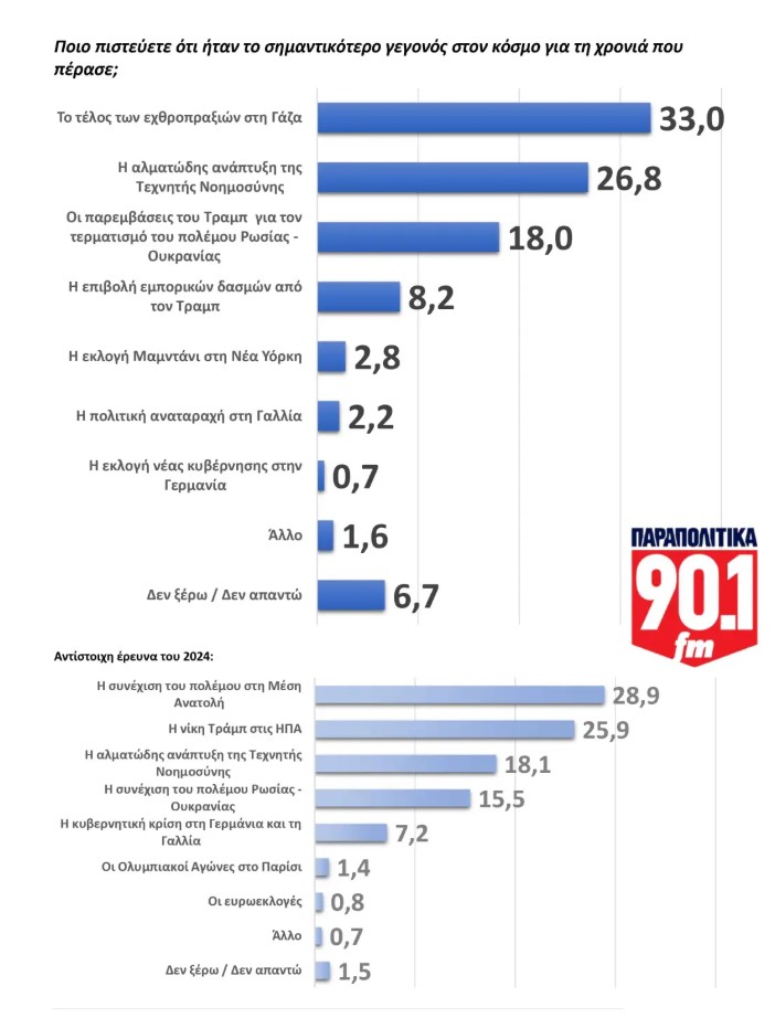 Τα σημαντικότερα γεγονότα στον κόσμο για τη χρονιά που φεύγει είναι για τους Έλληνες, σε ποσοστό 33%, το τέλος των εχθροπραξιών στη Γάζα, με 26,8% η αλματώδης ανάπτυξη της τεχνητής νοημοσύνης, οι παρεμβάσεις του προέδρου Τραμπ για τον τερματισμό του Ρωσο-ουκρανικού πολέμου με 18% και η επιβολή εμπορικών δασμών από τον πρόεδρο των ΗΠΑ με 8,2%.
