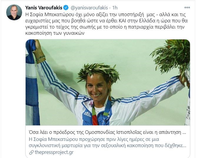 Την πλήρη στήριξή του στη Σοφία Μπεκατώρου εκφράζει με ανάρτησή του στο twitter ο γραμματέας του ΜέΡΑ 25 Γιάνης Βαρουφάκης., όπου αναφέρει: