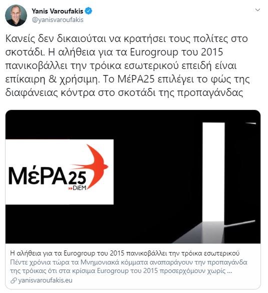 “Πρώτον, επειδή, όπως φάνηκε και στη σημερινή συζήτηση στη Βουλή για τα εργασιακά, η κυβέρνηση της ΝΔ εργαλειοποιεί συστηματικά τα ψεύδη για το τί γινόταν σε εκείνα τα Eurogroup για να εφαρμόζει ΣΗΜΕΡΑ πολιτικές εναντίον των εργαζόμενων, των δανειοληπτών, των νέων επιχειρηματιών κλπ. Δεύτερον, επειδή στην εργαλειοποίηση των ψεμάτων αυτών τείνει και ο ΣΥΡΙΖΑ, αν κρίνει κανείς από το Σχέδιο Απολογισμού για το 2015 με το οποίο πασχίζει να εξηγήσει την συνθηκολόγησή του με την τρόικα στη βάση διαστρεβλώσεων του τι συνέβαινε στα Eurogroup εκείνα. (Βλ. εδώ για σχετική ανάλυση). Τρίτον, επειδή το ΜέΡΑ25, και το DiEM25, έχουμε δεσμευτεί για διαφάνεια παντού – να καταστήσουμε, δηλαδή, τον πολίτη κοινωνό της διαδικασίας λήψης αποφάσεων που διαφεντεύουν την ζωή του”, γράφει ο κ. Βαρουφάκης.