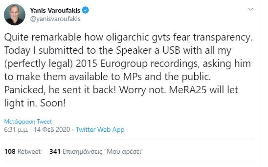Σχολιάζοντας την απόφαση του προέδρου της Βουλής να αρνηθεί να παραλάβει τις ηχογραφήσεις, ο επικεφαλής του ΜέΡΑ25, σημειώνει ότι ο κ. Τασούλας “αρνήθηκε την διακριτική ευχέρεια που του προσέφερα να επιλέξει εκείνος τον τρόπο με τον οποίο οι βουλευτές, αρχικά, και οι πολίτες, σε δεύτερο χρόνο, θα αποκτούσαν πρόσβαση στις κρίσιμες εκείνες συνεδριάσεις που επηρέασαν τόσο βάναυσα τις ζωές τους”.