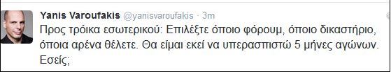 «Προς τρόικα εσωτερικού: Επιλέξτε όποιο φόρουμ, όποιο δικαστήριο, όποια αρένα θέλετε. Θα είμαι εκεί να υπερασπιστώ 5 μήνες αγώνων. Εσείς;», έγραψε στον προσωπικό του λογαριασμό στο Twitter, ο πρώην υπουργός Οικονομικών Γιάνης Βαρουφάκης, απαντώντας στις κατηγορίες που δέχεται τις τελευταίες ημέρες.