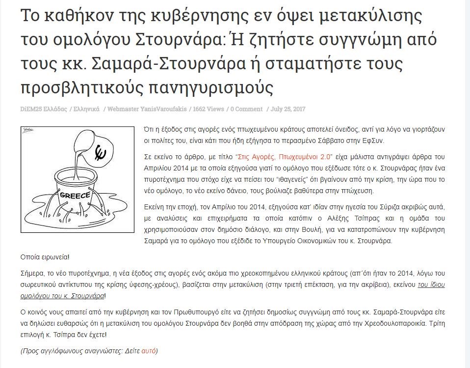 Αιχμές για την απόφαση της κυβέρνησης να προχωρήσει στην έκδοση νέου ομολόγου αφήνει ο πρώην υπουργός Οικονομικών Γιάνης Βαρουφάκης, καλώντας τον Αλέξη Τσίπρα είτε να ζητήσει συγγνώμη από τον Αντώνη Σαμαρά και τον Γιάννη Στουρνάρα, είτε να σταματήσει τους «προσβλητικούς πανηγυρισμούς».Σε άρθρο στο προσωπικό του μπλογκ, ο κ. Βαρουφάκης χαρακτηρίζει την επανέκδοση του ομολόγου «πυροτέχνημα» και σημειώνει:“Ότι η έξοδος στις αγορές ενός πτωχευμένου κράτους αποτελεί όνειδος, αντί για λόγο να γιορτάζουν οι πολίτες του, είναι κάτι που ήδη εξήγησα το περασμένο Σάββατο στην ΕφΣυν.Σε εκείνο το άρθρο, με τίτλο “Στις Αγορές, Πτωχευμένοι 2.0” είχα μάλιστα αντιγράψει άρθρα του Απριλίου 2014 με τα οποία εξηγούσα γιατί το ομόλογο που εξέδωσε τότε ο κ. Στουρνάρας ήταν ένα πυροτέχνημα που στόχο είχε να πείσει του “ιθαγενείς” ότι βγαίνουν από την κρίση, την ώρα που το νέο ομόλογο, το νέο εκείνο δάνειο, τους βούλιαζε βαθύτερα στην πτώχευση.Εκείνη την εποχή, τον Απρίλιο του 2014, εξηγούσα κατ’ ιδίαν στην ηγεσία του Σύριζα ακριβώς αυτά, με αναλύσεις και επιχειρήματα τα οποία κατόπιν ο Αλέξης Τσίπρας και η ομάδα του χρησιμοποιούσαν στον δημόσιο διάλογο, και στην Βουλή, για να κατατροπώνουν την κυβέρνηση Σαμαρά για το ομόλογο που εξέδιδε το Υπουργείο Οικονομικών του κ. Στουρνάρα.Οποία ειρωνεία!Σήμερα, το νέο πυροτέχνημα, η νέα έξοδος στις αγορές ενός ακόμα πιο χρεοκοπημένου ελληνικού κράτους (απ΄ότι ήταν το 2014, λόγω του σωρευτικού αντίκτυπου της κρίσης ύφεσης-χρέους), βασίζεται στην μετακύλιση (στην τριετή επέκταση, για την ακρίβεια), εκείνου του ίδιου ομολόγου του κ. Στουρνάρα!Ο κοινός νους απαιτεί από την κυβέρνηση και τον Πρωθυπουργό είτε να ζητήσει δημοσίως συγγνώμη από τους κκ. Σαμαρά-Στουρνάρα είτε να δηλώσει ευθαρσώς ότι η μετακύλιση του ομολόγου Στουρνάρα δεν βοηθά στην απόδραση της χώρας από την Χρεοδουλοπαροικία. Τρίτη επιλογή κ. Τσίπρα δεν έχετε!»