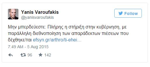 Ο πρώην Υπουργός Οικονομικών, Γιάνης Βαρουφάκης, με ανάρτησή του στο Twitter, απαντά σε άρθρο της «Εφημερίδας των Συντακτών» που διερωτάται «τι έχει στο μυαλό του ο Βαρουφάκης;», λέγοντας πως, στηρίζει πλήρως την Κυβέρνηση και πως, με τις κατά καιρούς τοποθετήσεις του, κυρίως σε ξένα ΜΜΕ, διεθνοποιεί τις «απαράδεκτες» – όπως τις χαρακτηρίζει – πιέσεις, «που δέχθηκε ή και δέχεται ακόμη».