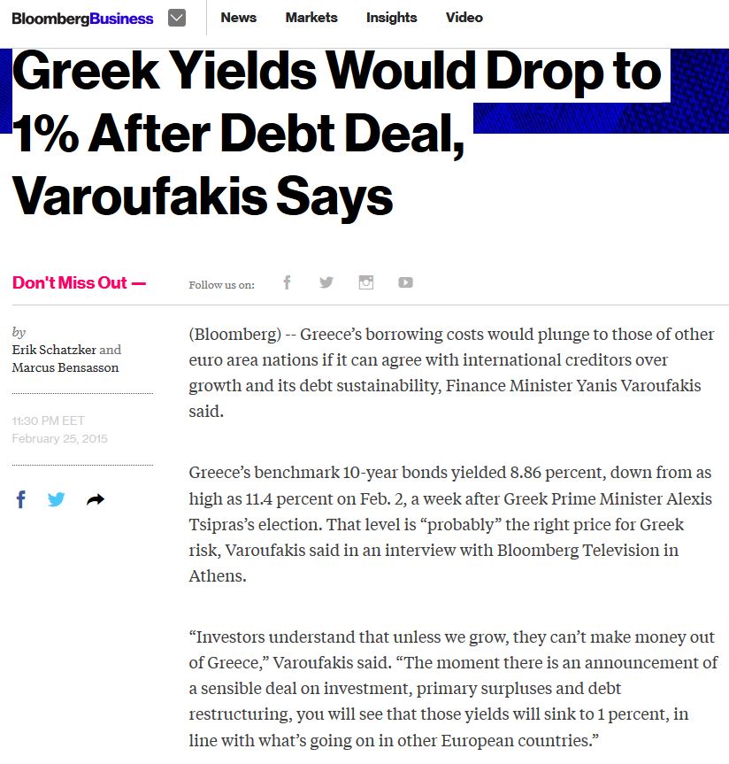 Τώρα οι αποδόσεις των ελληνικών κρατικών ομολόγων είναι ακόμα ψηλά, αν και έπεσαν από τα υψηλά του 11,4% στο 8,8%. «Οι επενδυτές κατανοούν ότι αν δεν αναπτυχθούμε, δεν μπορούν να βγάλουν λεφτά από την Ελλάδα», είπε ο Γ. Βαρουφάκης.