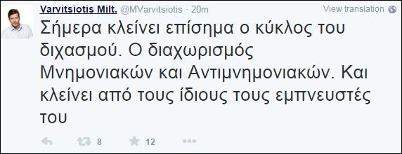 “Ο διαχωρισμός Μνημονιακών και Αντιμνημονιακών. Και κλείνει από τους ίδιους τους εμπνευστές του”, αναφέρει.