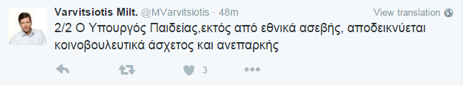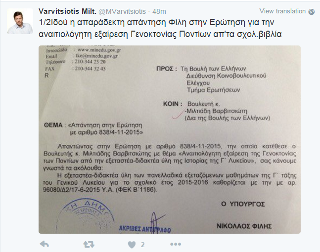 Κριτική στον Νίκο Φίλη, ασκεί ο βουλευτής της Νέας Δημοκρατίας Μιλτιάδης Βαρβιτσιώτης με αφορμή την απάντηση του υπουργού Παιδείας για την εξαίρεση της Γενοκτονίας των Ποντίων από τα σχολικά βιβλία, χαρακτηρίζοντας τον «εθνικά ασεβή, κοινοβουλευτικά άσχετο και ανεπαρκή».