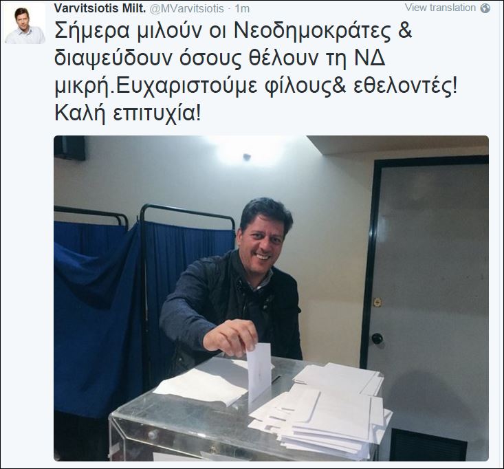 «Σήμερα μιλούν οι Νεοδημοκράτες και διαψεύδουν όσους θέλουν τη ΝΔ μικρή. Ευχαριστούμε φίλους& εθελοντές! Καλή επιτυχία!» , έγραψε ο κ. Βαρβιτσιώτης.