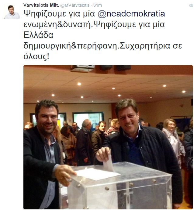 «Ψηφίζουμε για μία Νέα Δημοκρατία ενωμένη και δυνατή. Ψηφίζουμε για μία Ελλάδα δημιουργική και περήφανη. Συγχαρητήρια σε όλους», έγραψε στον προσωπικό του λογαριασμό στο Twitter, ο βουλευτής της Νέας Δημοκρατίας, Μιλτιάδης Βαρβιτσιώτης, ανεβάζοντας παράλληλα μία φωτογραφία τη στιγμή που βρισκόταν μπροστά από την κάλπη.