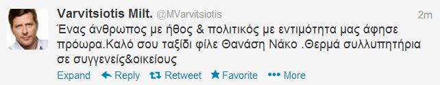 “Ένας άνθρωπος με ήθος και πολιτικός με εντιμότητα μας άφησε πρόωρα. Καλό σου ταξίδι φίλε Θανάση Νάκο. Θερμά συλλυπητήρια σε συγγενείς και οικείους”, έγραψε στο twitter ο Μιλτιάδης Βαρβιτσιώτης.
