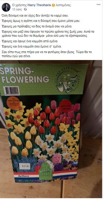 Σου είπα πως στα πήρα για να τα φυτέψεις όταν βγεις. Τώρα θα τα ποτίσω εγώ για σένα” έγραψε ο υπουργός Τουρισμού στο Facebook ανεβάζοντας την παρακάτω φωτογραφία.