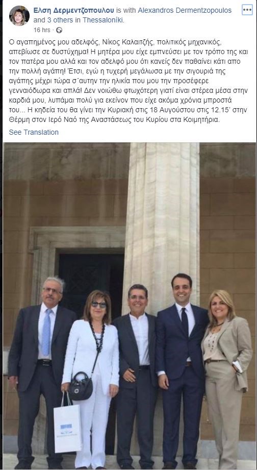 Ο Νίκος Καλαϊτζής, πολιτικός μηχανικός στο επάγγελμα, έχασε τη ζωή του και η αδερφή του Έλση Δερμεντζοπούλου, σύζυγος του πρώην υφυπουργού και βουλευτή και μητέρα του νυν βουλευτή της Ν.Δ, με ανάρτηση στον προσωπικό της λογαριασμό τον αποχαιρέτησε με συγκινητικό τρόπο.