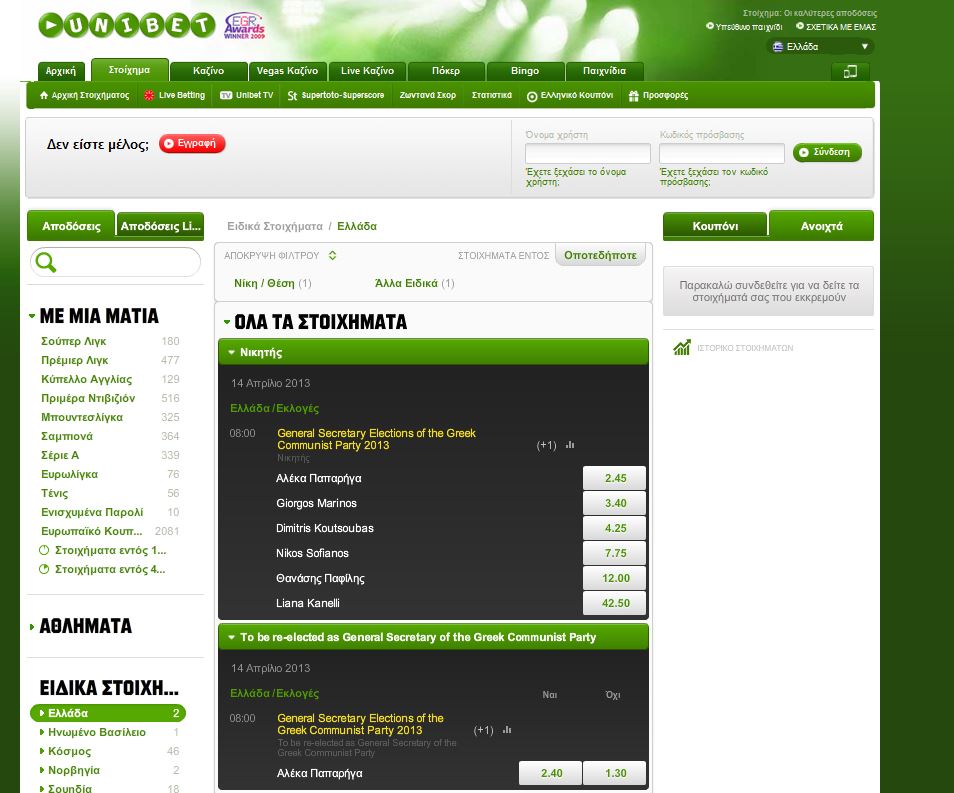 Η Unibet, είναι η μόνη εταιρία που προσφέρει στοιχήματα για την Ελληνική επικαιρότητα και ήδη έχει βγάλει αποδόσεις για το “ποιός θα είναι ο επόμενος Γενικός Γραμματέας του ΚΚΕ” και όχι μόνο.