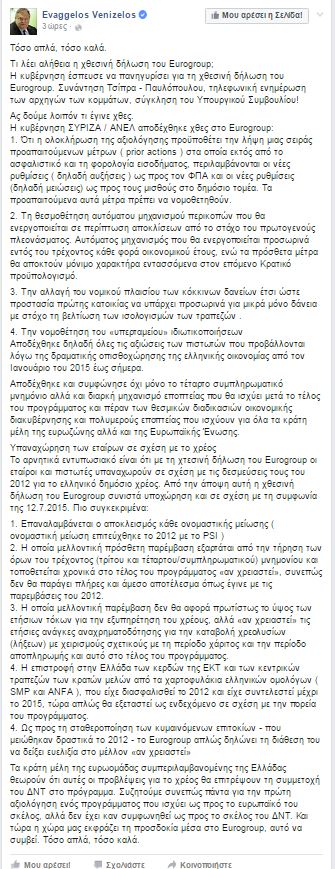 Διαβάστε αναλυτικά όσα έγραψε στο facebook ο Ευάγγελος Βενιζέλος: