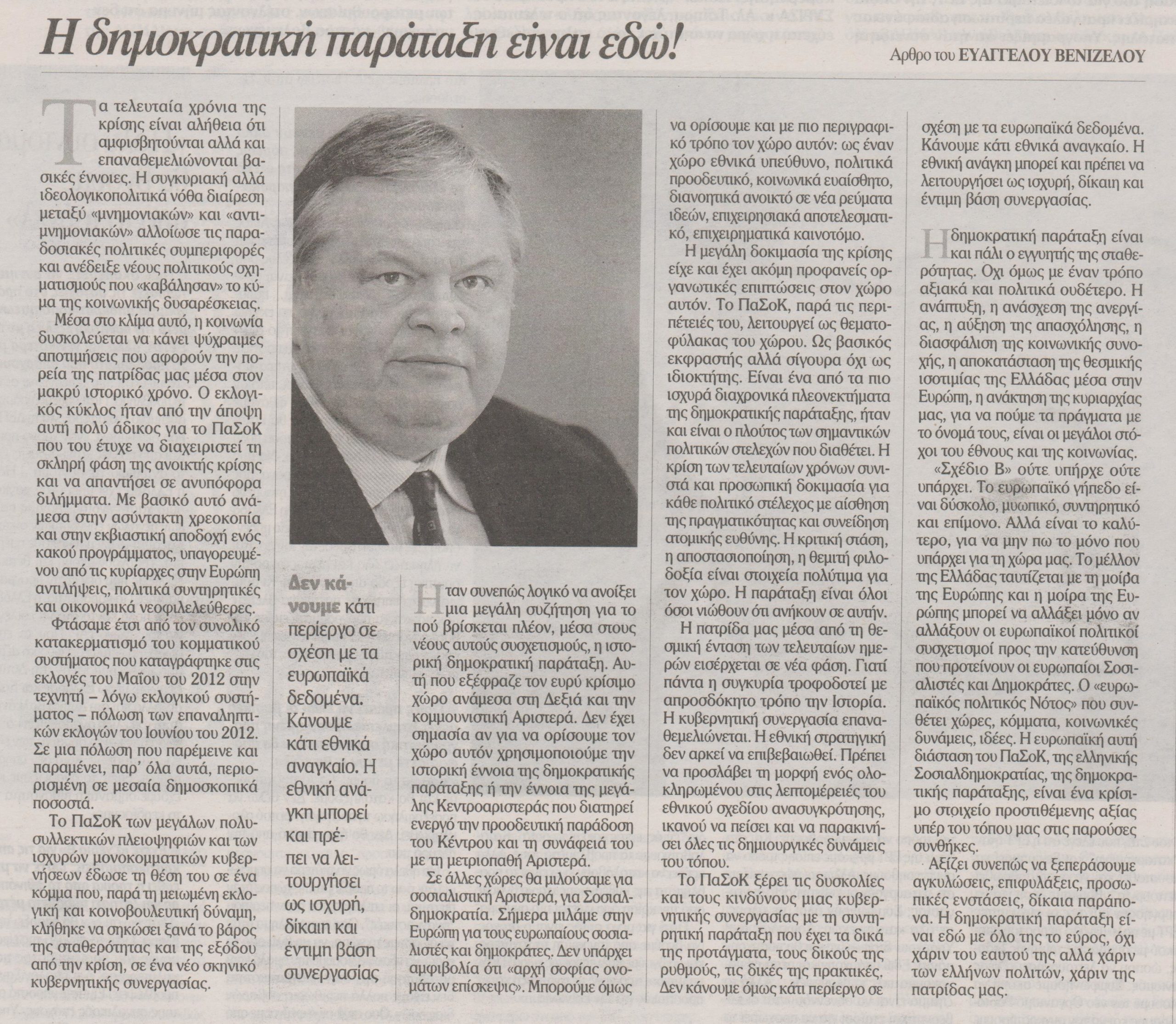 «Μέσα στο κλίμα αυτό, η κοινωνία δυσκολεύεται να κάνει ψύχραιμες αποτιμήσεις που αφορούν στην πορεία της πατρίδας μας μέσα στο μακρύ ιστορικό χρόνο», τονίζει ο Ε. Βενιζέλος, μεταξύ άλλων, στο άρθρο του.